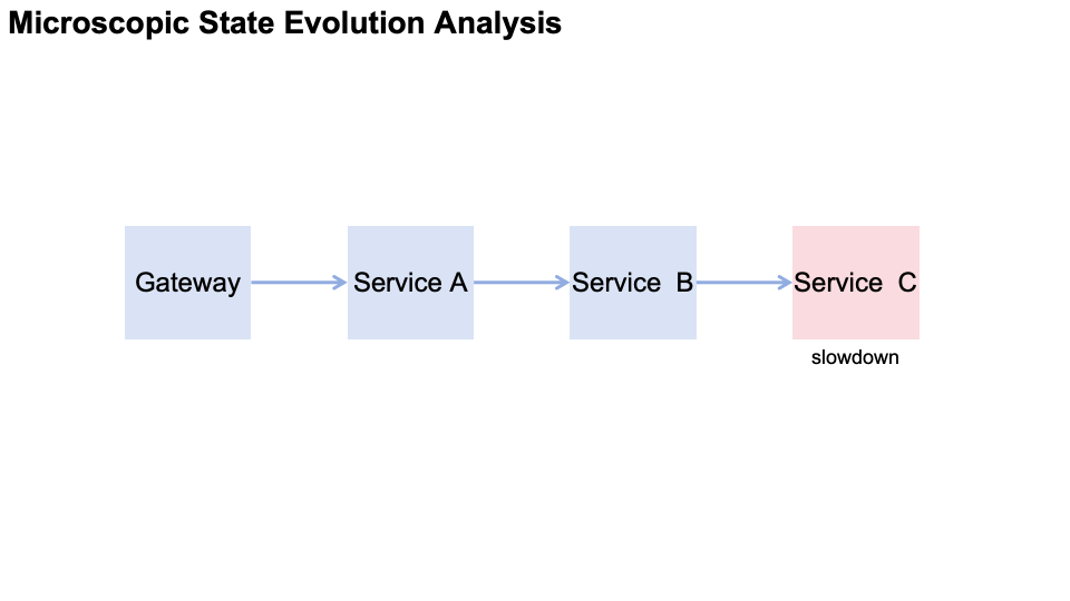 接下来,让我带大家从微观层面看一下雪崩过程发生了什么。在这个抽象例子中,拓扑结构为 gateway → A → B → C,其中服务 C 变慢并成为触发点。