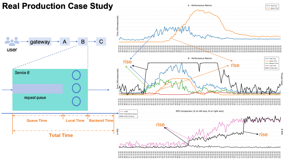 让我们用真实的生产数据来验证前面的模型。由于这个故障发生在几年前,我们现在展示的这些指标是当时能够获取到的最完整的一组,尽管未能把前面模型里提到的所有指标都收集到。左边这个小图把 B 的总时间拆成了三部分:排队时间、本地处理时间、以及后端时间;右边的三张曲线的时间轴是对齐的。