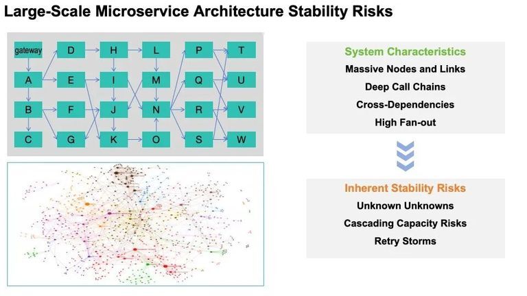 大规模微服务系统本质是一张由大量节点和依赖交织而成的网络。请求从入口 gateway 进入系统,再层层向下形成深度调用链,往往还伴随着交叉依赖与高扇出。这种特点虽然带来了灵活性与扩展性,但天然埋着三类稳定性风险:其一是“未知中的未知”,如冷门链路、冷门代码在突发场景被激活;其二是容量级联风险,任一节点变慢都会把反压沿链路放大回传;其三是重试风暴,自我强化的流量会指数级扩散。在这种架构中,任何局部抖动都会以毫秒级在系统中传播。理解这张网络,就为理解‘雪崩’发生的原因奠定了基础。
