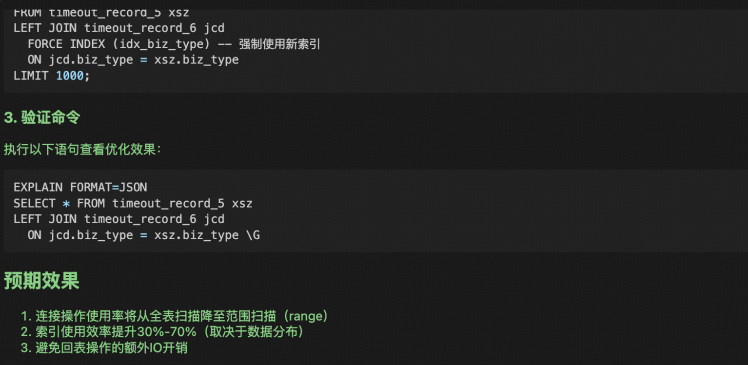 请按照以下JSON格式回复:{{ "thoughts": "分析思路", "sql": "SQL查询语句", "explain": "优化后的DQL语句执行结果"}}"""
