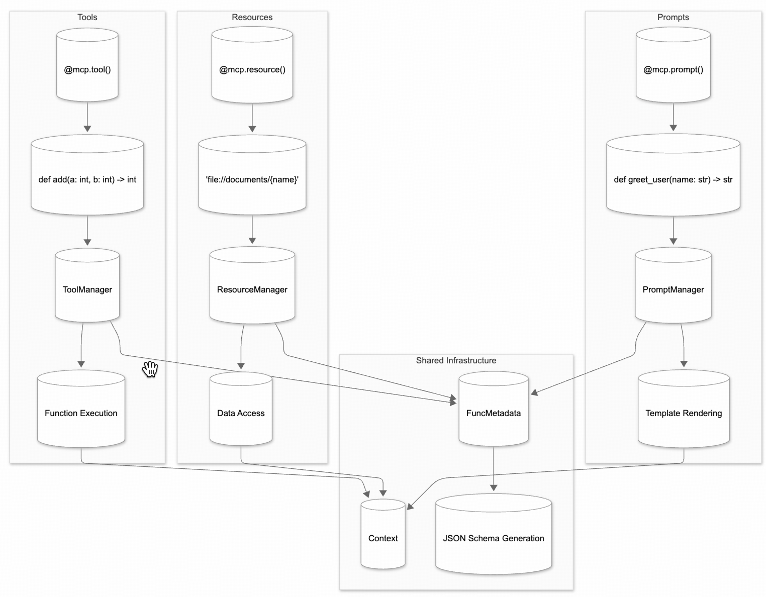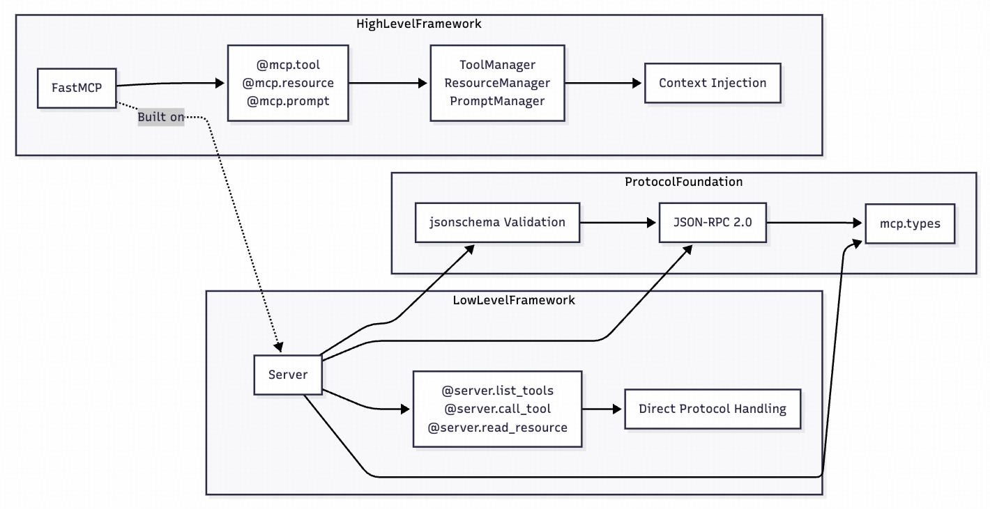 MCP Server 作为 MCP 架构的核心部分,在提升 AI 应用性能方面发挥着不可替代的关键作用。其 Python 版 SDK 提供的框架图如下: