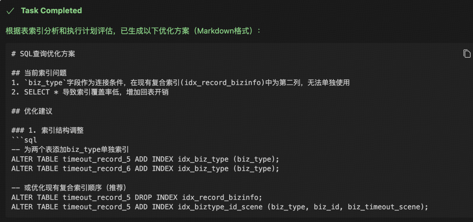 # 如果有SQL查询,执行它if response_data.get("sql"): # 执行SQL查询 query_result = await self.session.call_tool("query_data", { "sql": response_data["sql"], "session_id": self.session_id }) # 构建最终响应 final_response = { "thoughts": response_data["thoughts"], "sql": response_data["sql"], "display_type": response_data.get("display_type", "Table"), "results": json.loads(query_result.content[0].text) if query_result.content[0].text else None } return json.dumps(final_response, ensure_ascii=False, indent=2)