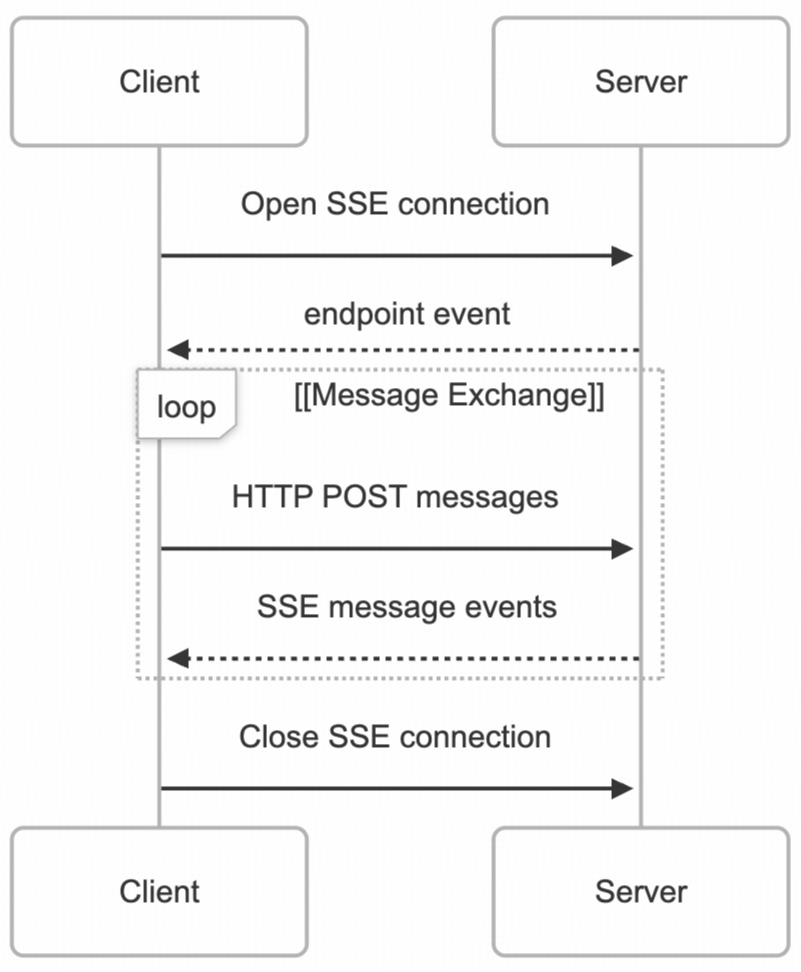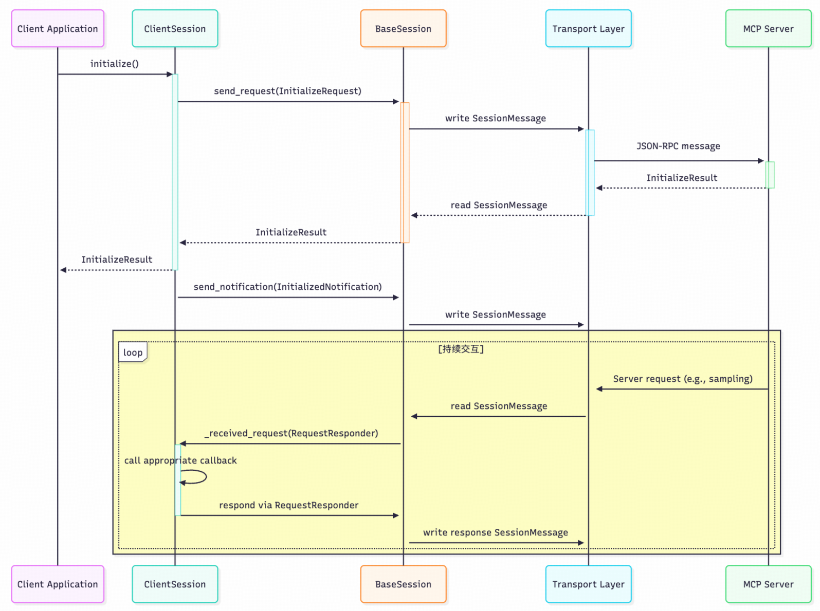 此处,我们先不看他的通信机制,结合 MCP-DB-GPT 项目仅关注 ClientSession 是如何与服务器层交互的。从宏观上看,客户端与服务器端的消息流大致如下: