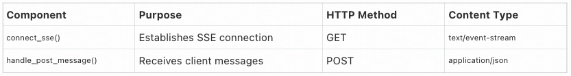 if self.is_json_response_enabled: # Process the message metadata = ServerMessageMetadata(request_context=request) session_message = SessionMessage(message, metadata=metadata) await writer.send(session_message) try: # Process messages from the request-specific stream # We need to collect all messages until we get a response pass finally: await self._clean_up_memory_streams(request_id)else: # Create SSE stream sse_stream_writer, sse_stream_reader = anyio.create_memory_object_stream[dict[str, str]](0) async def sse_writer(): # Get the request ID from the incoming request message