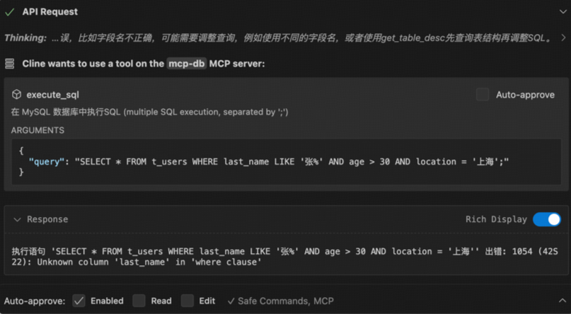 生成 SQL 后与服务器层的二次交互:在 process_query 中,如果 LLM 响应包含 sql 字段(如"sql":"SELECT * FROM users"),客户端自动调用 session.call_tool("query_data", params)。
