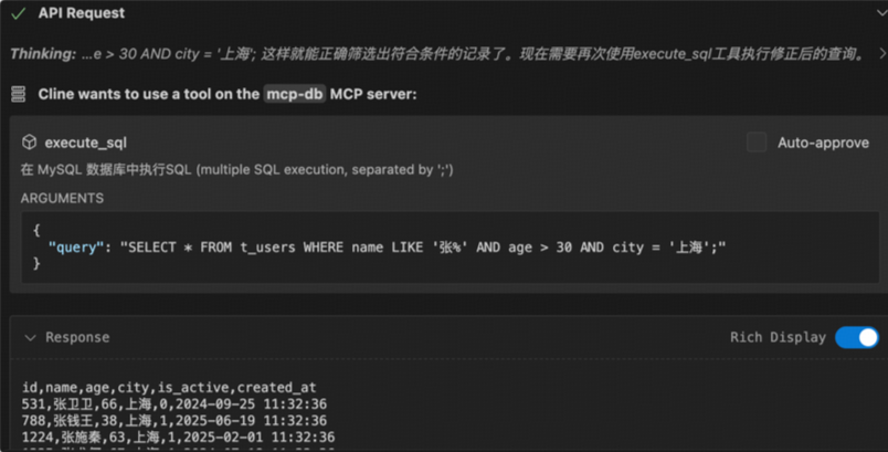 此交互完成 MCP 的"执行-响应"闭环:SQL 作为工具调用的参数,服务器执行后返回结构化数据,客户端整合为最终响应。