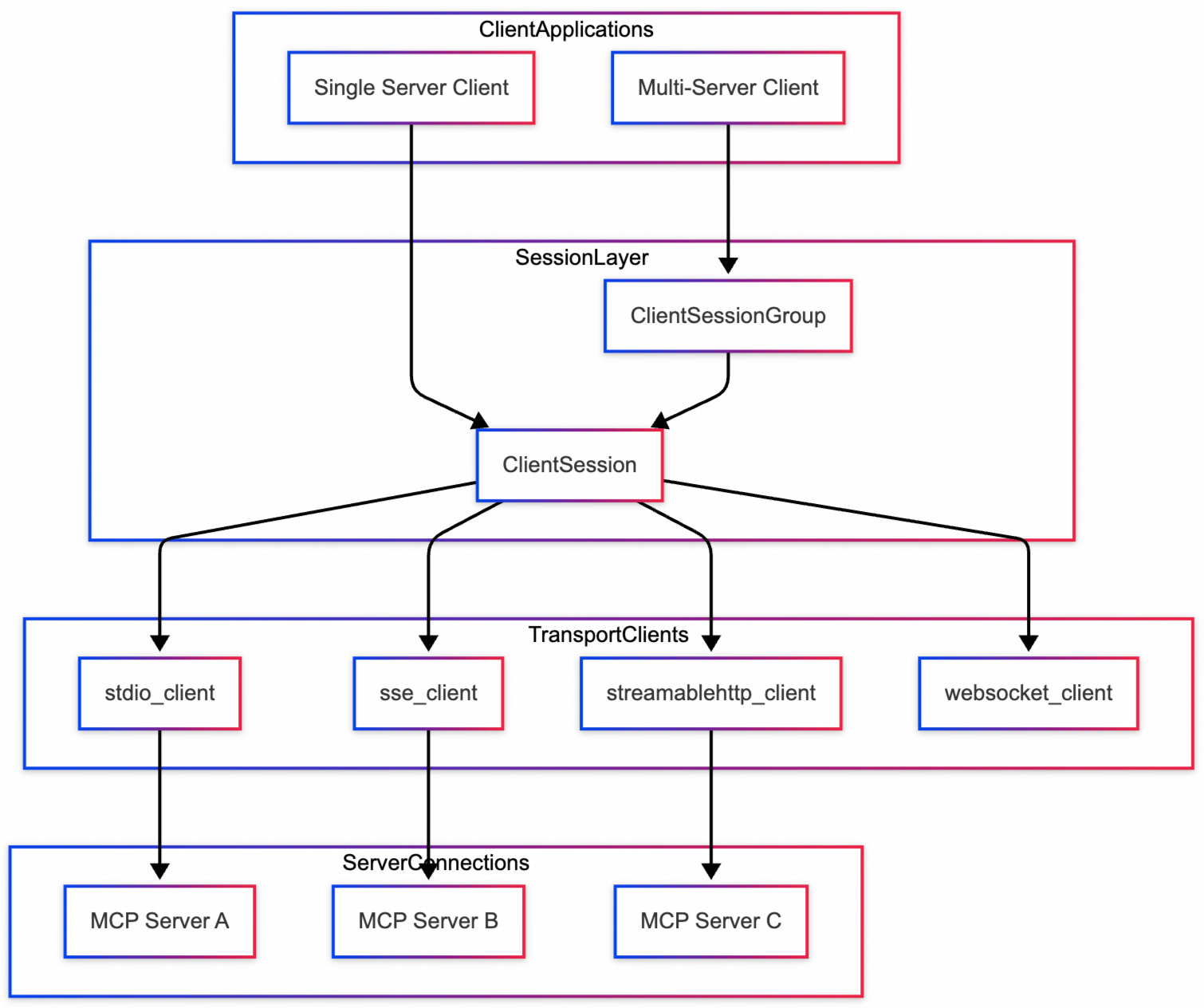 MCP Client 在整个模型交互过程中则起着至关重要的桥梁作用,连接着 LLM 与 MCP Server。其 Python 版 SDK 提供的框架图如下: