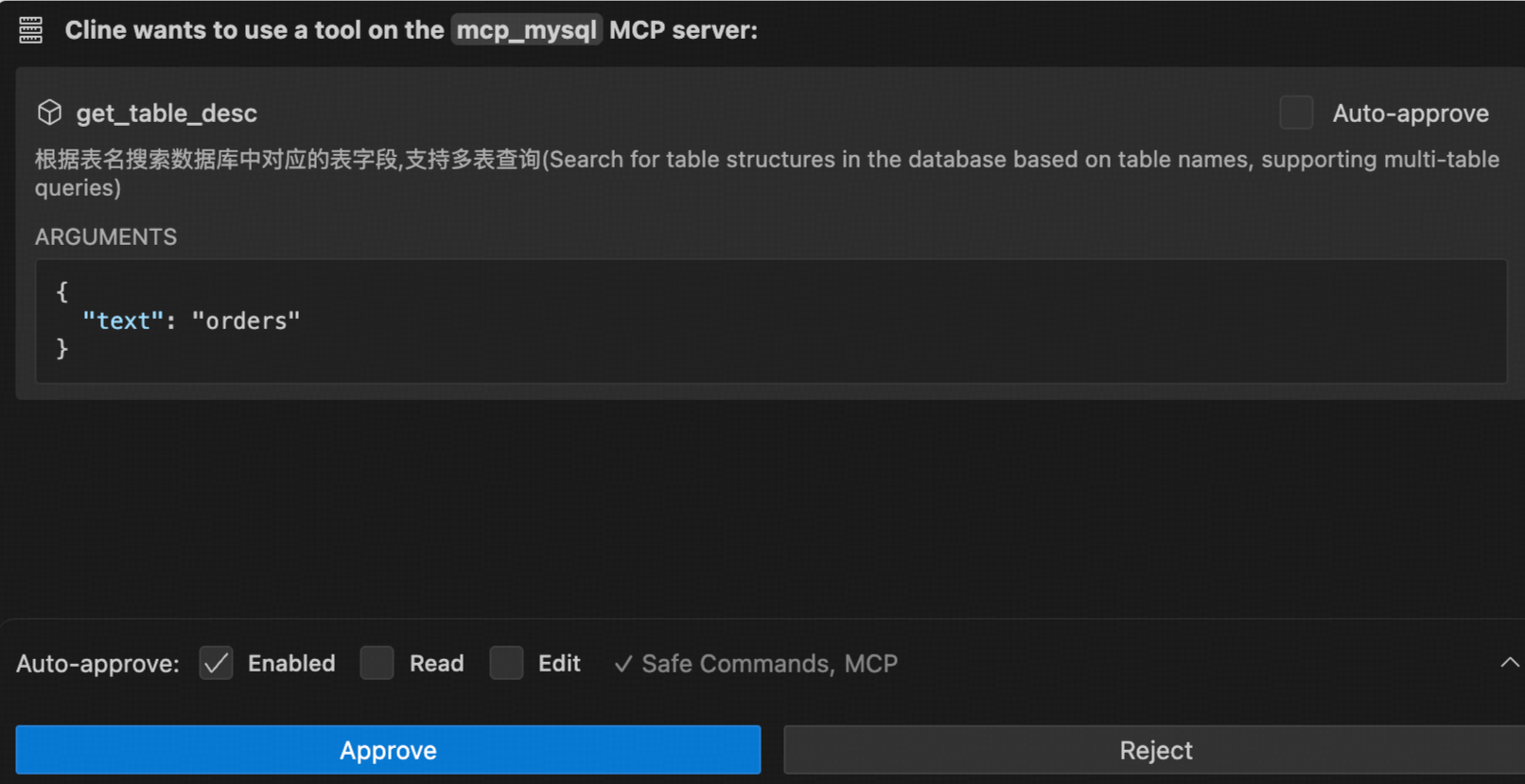 return Tool( name=self.name, description=self.description, inputSchema={ "type": "object", "properties": { "host": {"type": "string", "description": "数据库主机地址"}, "port": {"type": "integer", "description": "数据库端口"}, "user": {"type": "string", "description": "数据库用户名"}, "password": {"type": "string", "description": "数据库密码"}, "database": {"type": "string", "description": "数据库名称"} }, "required": ["host", "port", "user", "password", "database"] })