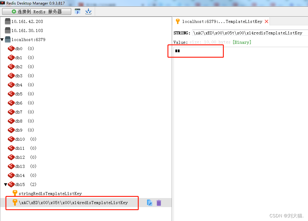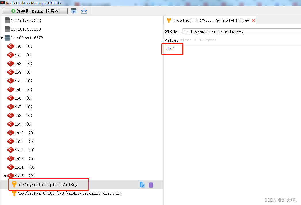 可以发现 stringRedisTemplate 存入的还是字符串样式,能直接看出属性值为 def,<font color='red'>然而 RedisTemplate 存入的 key 值前面居然多加了一串 16 进制的字符串值,同时存入 redis 的结果也是转换为字节数组 bytes 之后的看不懂的值</font>。