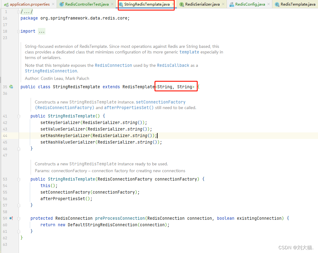 StringRedisTemplate 是继承 RedisTemplate 的,一般来说子类继承父类,应该能实现更多的功能,但是此处我们发现 StringRedisTemplate 继承的是 RedisTemplate 的泛型类,指定了 String-String 的泛型!故功能只专注于 String 类型!