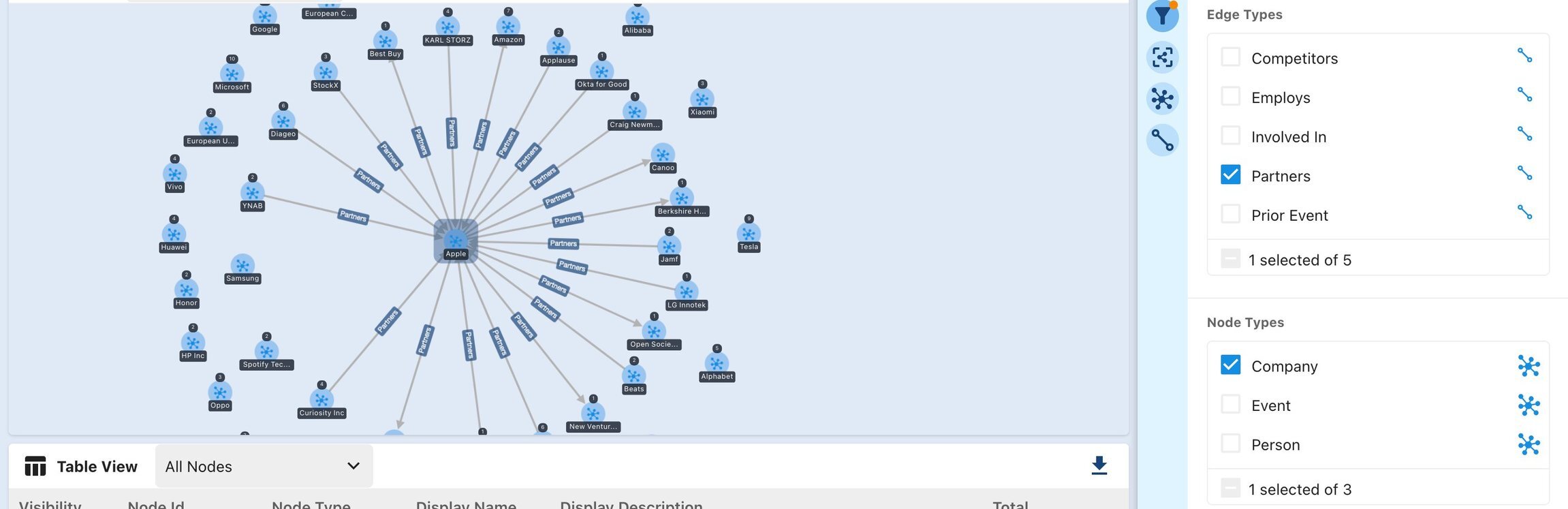 获取与顶点‘Apple’相连接的所有边及其相邻顶点的路径,筛选出竞争关系和合作关系的组织: