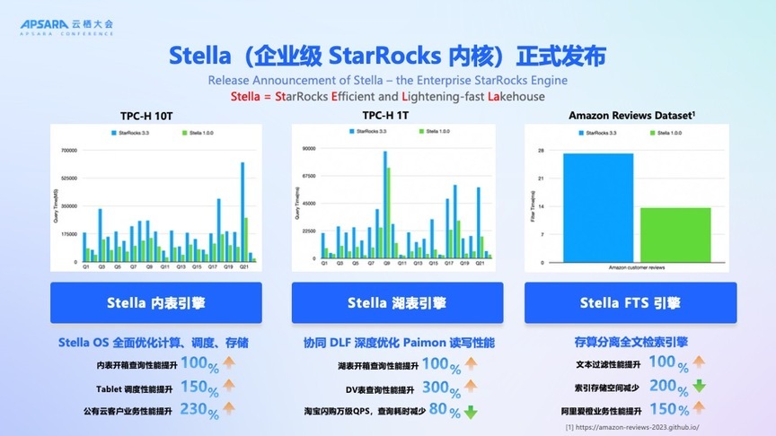 2025 年云栖大会,EMR Serverless StarRocks 重磅发布全新企业级版本内核 Stella (StarRocks Efficient and Lightening-fast Lakehouse),完全兼容开源 StarRocks,为用户提供企业级的产品功能、卓越的性能及稳定性保障。