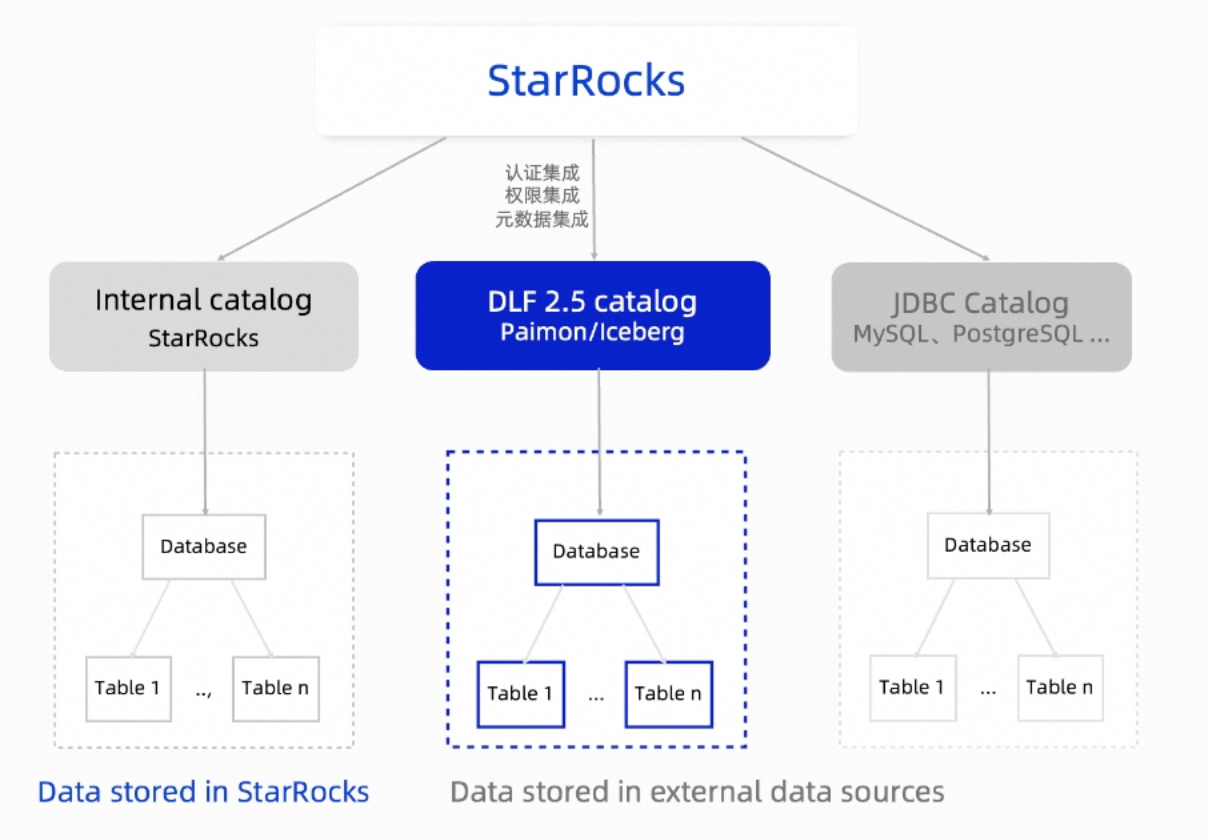 通过与 Data Lake Formation 的深度集成,用户只需简单创建 catalog 即可访问 DLF 中的数据表,权限配置在 DLF 中即可自动同步至 StarRocks,实现真正的即开即用。