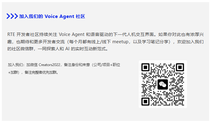 最终,主持人林旅强将个人的参与热情升华为对整个行业的呼吁。他不仅强调了 RTE 开发者社区作为技术交流平台 365 天不打烊的活力,更指出 RTE 开发者社区的愿景是成为中国能牵头的中坚力量,去改变这个世界的技术。他鼓励所有开发者和创作者,借助社区力量,将技术提炼、场景验证,并在商业上有所提升,共同将 RTE 领域推向全球技术的前沿。