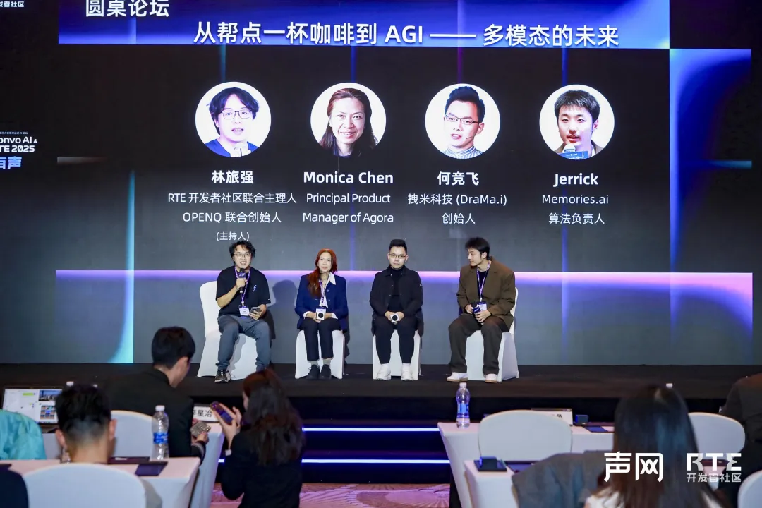 本次主题为「从帮点一杯咖啡到 AGI——多模态的未来」的圆桌讨论由 RTE 开发者社区的联合主理人,OpenQ 联合创始人林旅强主持,参与讨论的嘉宾还有 Agora 的 Principal Product Manager Monica Chen、拽米科技(DraMa.i)创始人何竞飞以及 Memories.ai 算法负责人** Jerrick**。