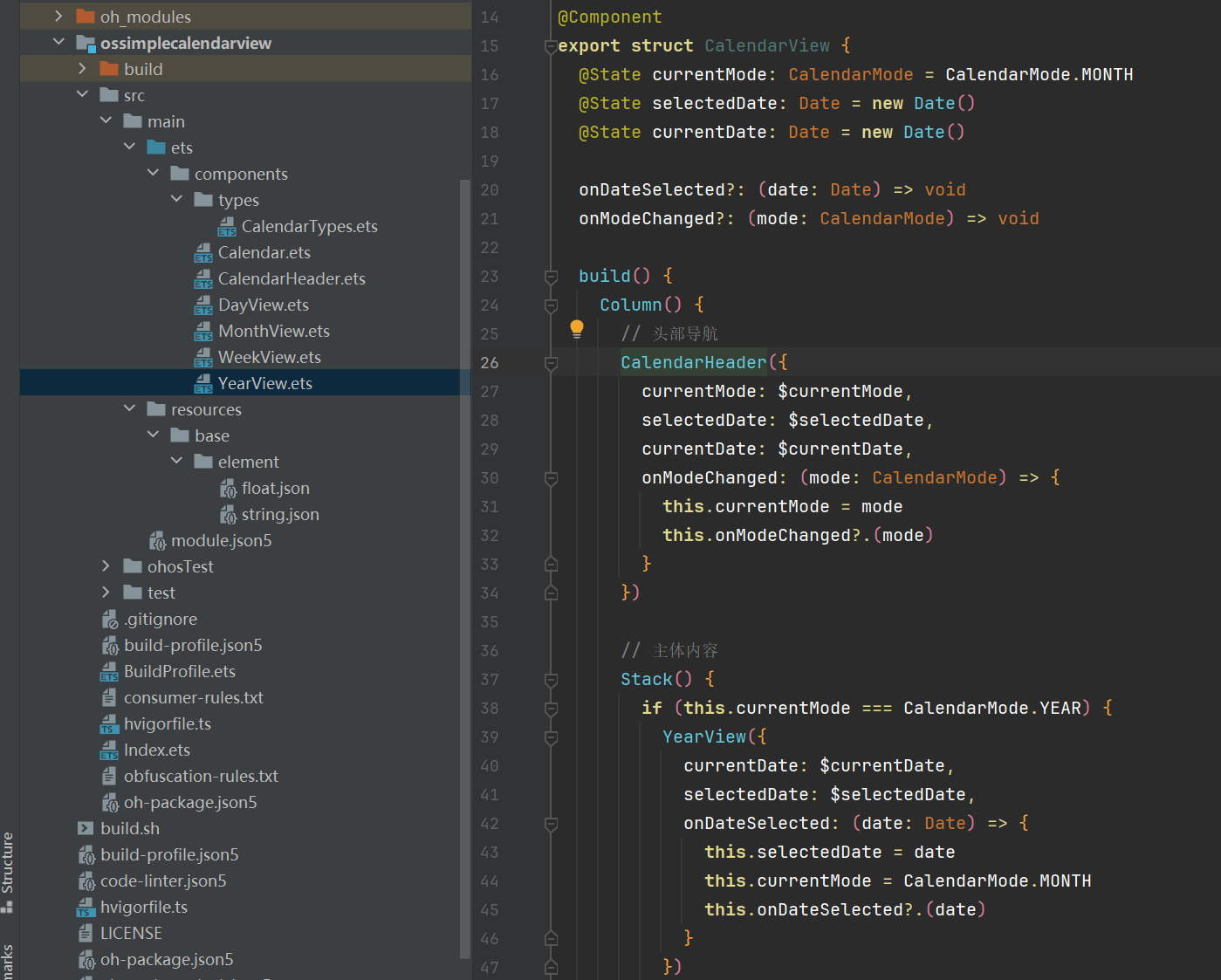 先明确组件库的核心定位:这是一个基于 HarmonyOS ArkUI 框架、用 ArkTS 编写的轻量级日历组件库,主打“开箱即用”和“多模式覆盖”。不像一些复杂组件库那样包含过多冗余功能,它只聚焦日历的核心需求——日期展示、模式切换、日期选中,同时预留了扩展接口,平衡了“易用性”和“灵活性”。