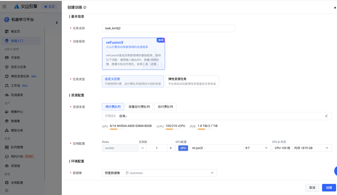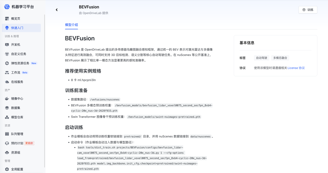 1.从快速入门选择需要训练的智驾模型,并且配置实例规格及模型输出路径。