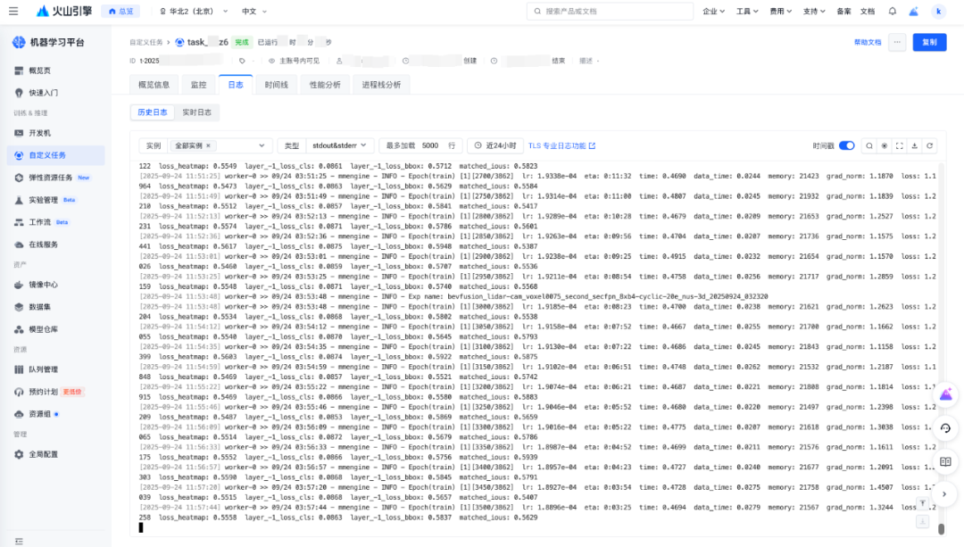 2.创建任务后可在「任务详情-日志」中查看训练详情,也可在「任务详情-监控」中查看资源利用率。