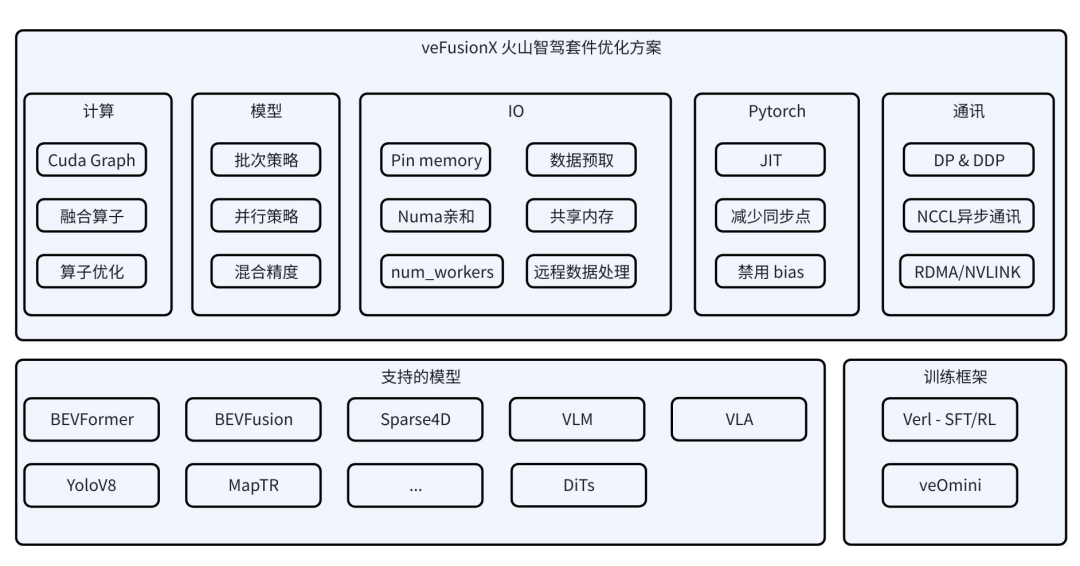 为了应对这些挑战,火山引擎推出 veFusionX 自动驾驶全场景训练加速框架—— 定位为「即插即用的效率套件」,覆盖传统智驾模型 + 端到端 VLM/VLA 大模型。