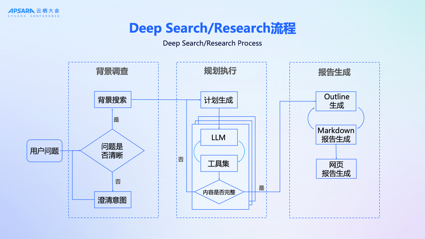 在 Deep Search/Research 的执行过程中,阿里云将任务处理拆分为背景调查—规划执行—报告生成三个阶段。这一流程确保了从用户提问到成果产出的全过程可控、精确与高效,特别适合多步推理和复杂研究类任务。具体流程图如下:
