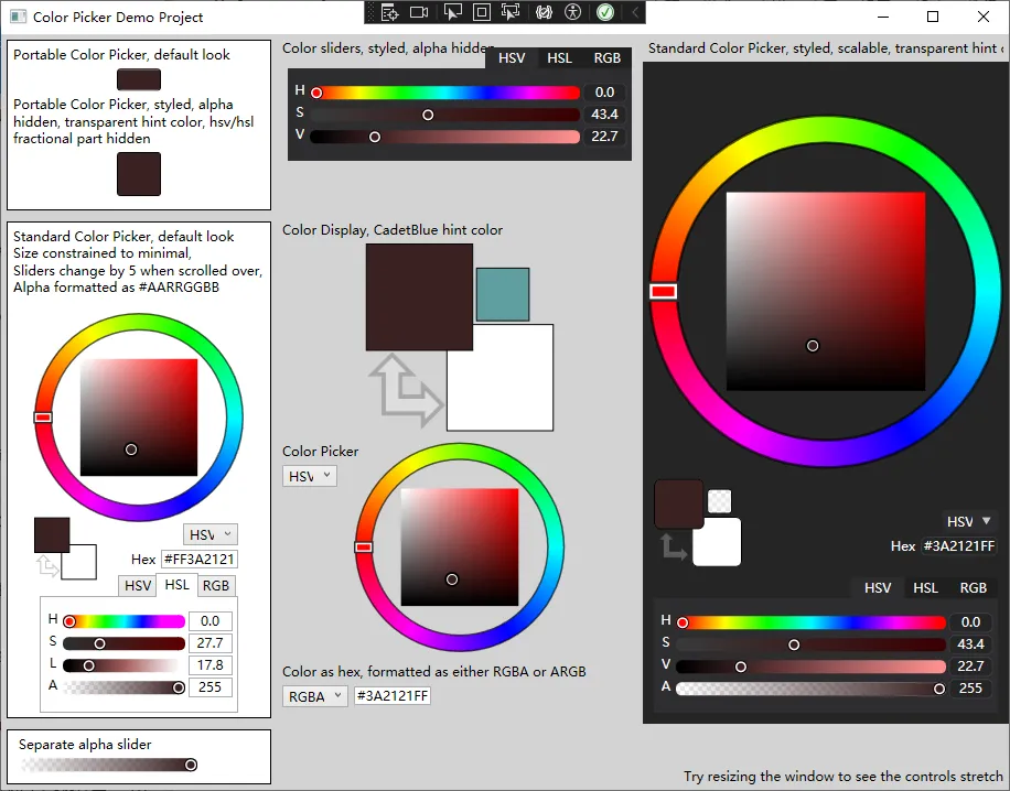 项目简介: ColorPicker 是一款适用于 WPF 和 AvaloniaUI 的可定制颜色选择器控件,支持 RGB、HSV、HSL 等多种色彩模式,能够轻松集成到你的 .NET 桌面应用中,为用户提供流畅精准的选色体验。