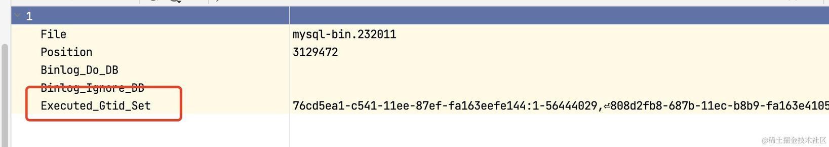 在 master 节点执行 show master status,也能看到 GTID 集合,Executed_Gtid_Set 为 master 节点执行过的 GTID 集合。如下图所示,