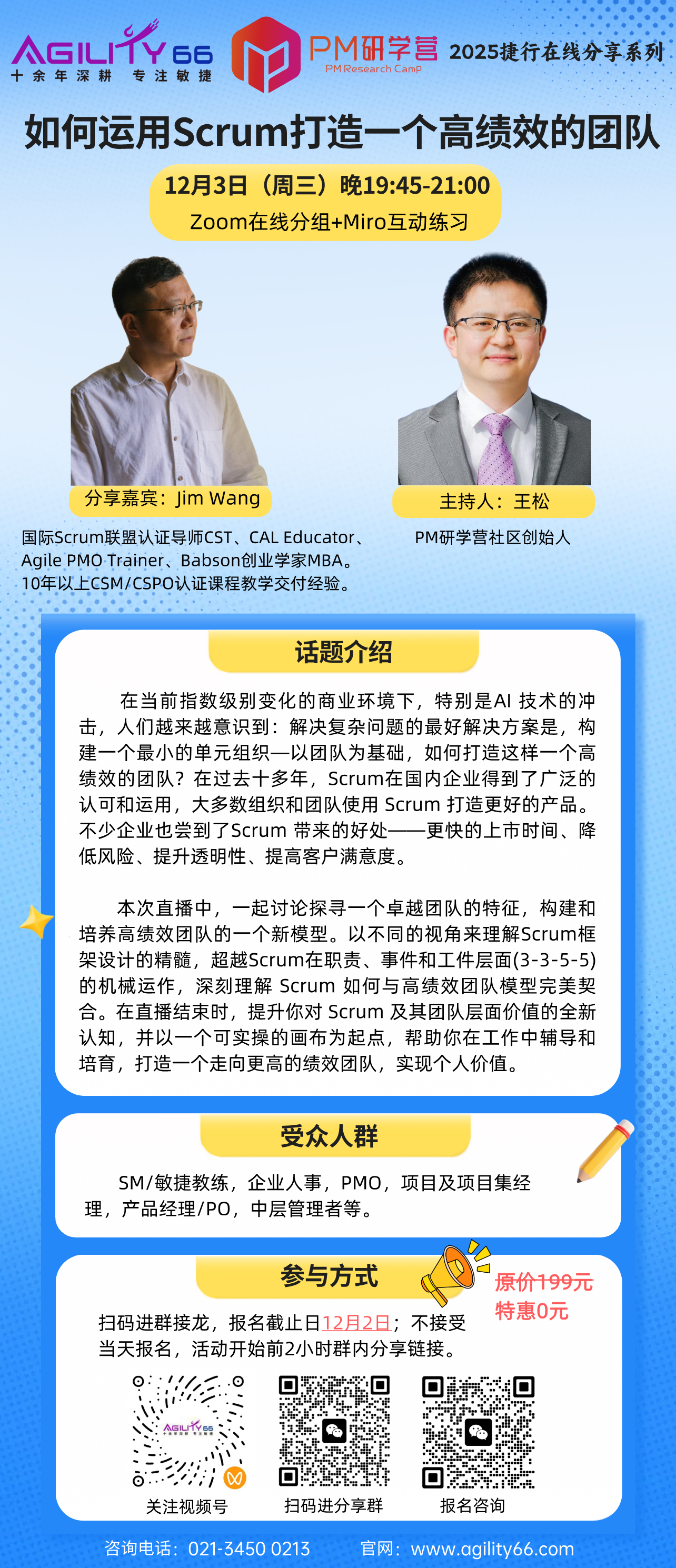 💡这场直播不聊空理论,只讲真方法:高绩效团队的核心特征、全新构建模型、Scrum 框架的深层逻辑,还有可直接落地的实操画布!帮你快速辅导团队、实现绩效跃迁,干货密度超标。