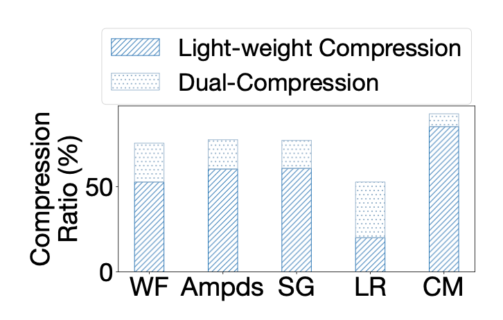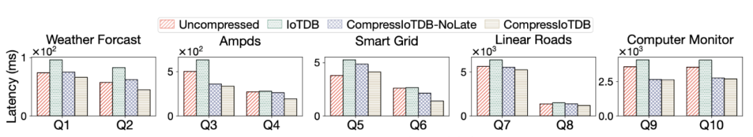 3.CompressIoTDB-NoLate:禁用了延迟解压优化的 CompressIoTDB 版本,用于评估该项优化的具体贡献。