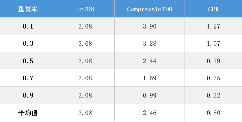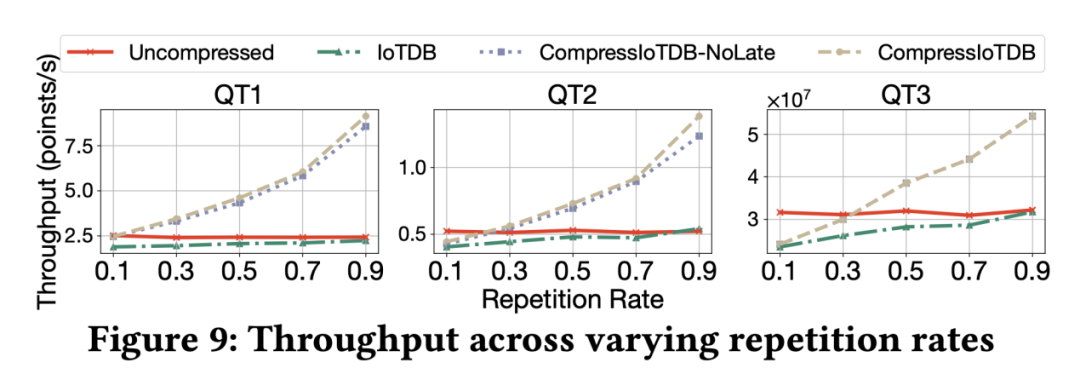 1.不同重复率:如图 9 所示,随着数据重复率的提高,RLE 编码效率增加,CompressIoTDB 的性能优势也随之急剧增长,最高可比 IoTDB 快 75.5%。