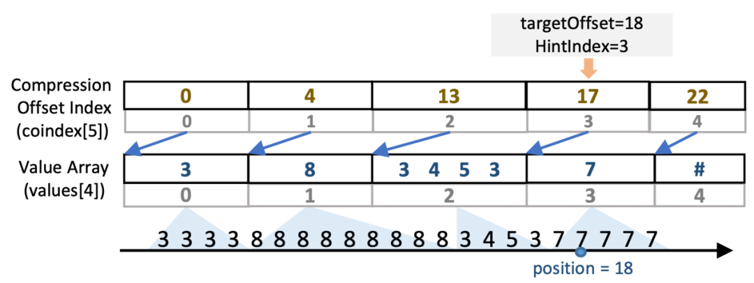 以图 3 为例,当需要访问逻辑位置为 18 的数据时,系统首先通过 compressionOffsetIndex 定位到包含该位置的压缩块。通过查找,发现 coIndex = 17 而 coIndex = 22,因此目标位置 18 落在第四个压缩块 values 的范围内。由于该块是 RLE 编码的值为 7 的行程,系统便可直接返回 7。如果下一次访问是位置 19,hintIndex(此时为 3)将帮助系统立即在同一压缩块内定位,避免了重复的索引查找。