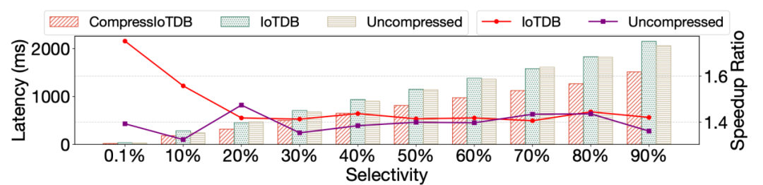 3.不同查询选择率:如图 11 所示,在低选择率(只查询少量数据)的查询中,CompressIoTDB 的优势最为明显,最高可比 IoTDB 快 42.9%。这主要归功于延迟解压策略,它避免了为获取少量数据而解压整个数据块的巨大浪费。