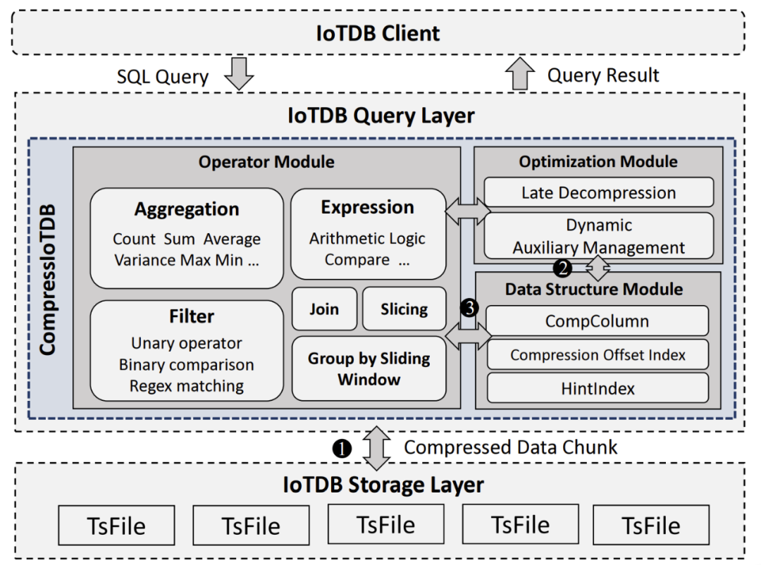 如图 2 所示,CompressIoTDB 的整体架构由三大核心模块构成,它们协同工作,共同完成从 SQL 解析到结果返回的整个流程。