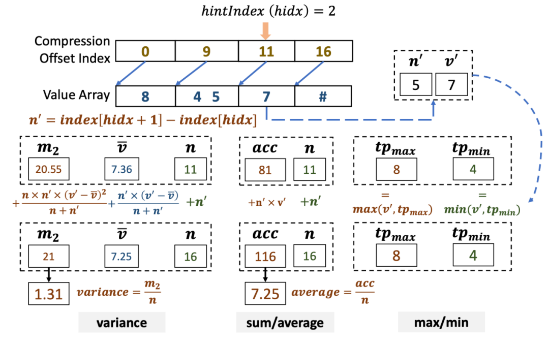 ·聚合算子 (Aggregation):聚合计算采用增量更新的方式。算子在内部维护一个状态累加器(如 count, sum, sum_of_squares 用于计算方差)。当处理 RLE 编码的数据时,对于每个行程(value, length),状态的更新可以通过数学公式一次性完成,而不是循环 length 次。