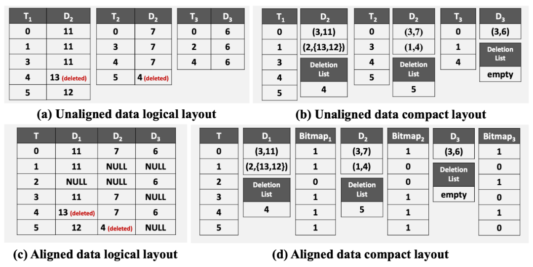 ·问题背景:在生产环境中,数据并非总是整洁的。对齐的时间序列(多个传感器共享一个时间戳列)会因数据缺失而产生大量空值,这些空值通常由一个独立的位图(bitmap)来管理。此外,为了提高写入性能,删除操作通常采用“懒删除”(lazy deletion),即只在一个删除列表中记录要删除数据的位置,而不立即进行物理删除。在查询时,传统方法需要先解压数据,然后根据位图和删除列表恢复出完整的逻辑视图,这个过程开销巨大且破坏了数据的压缩结构。