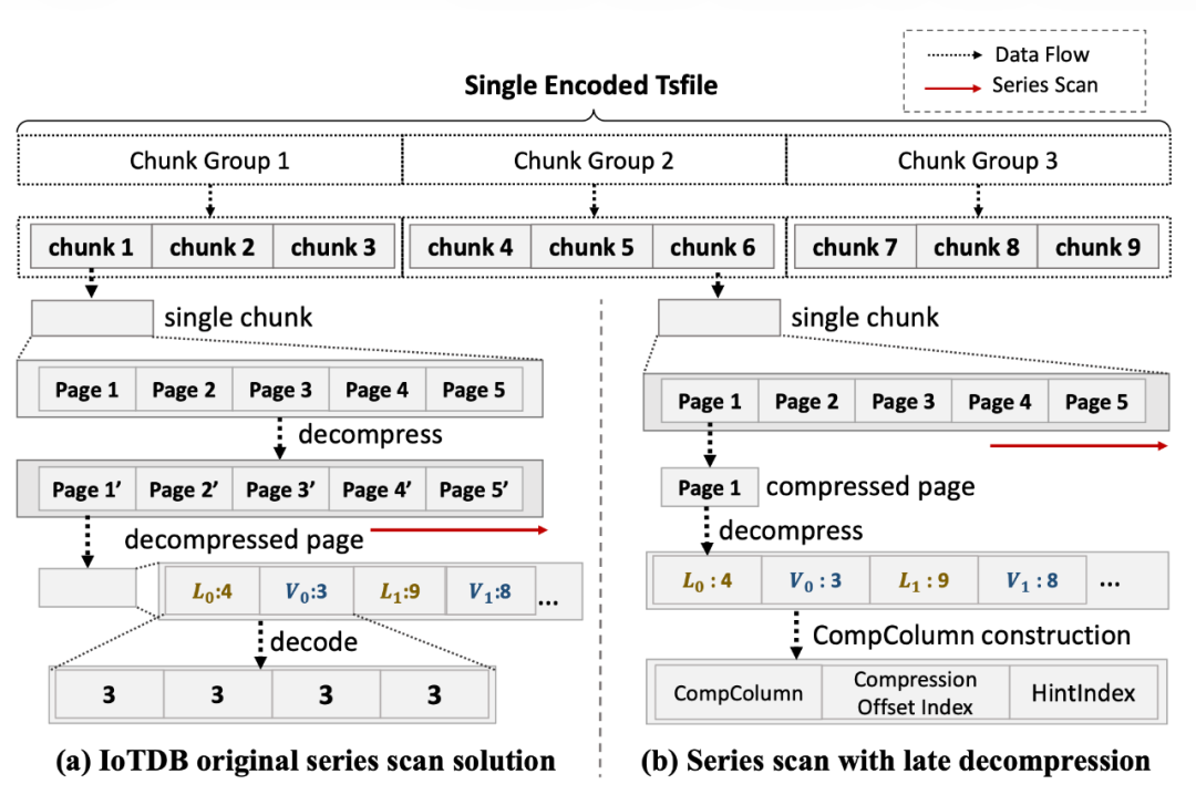 ·问题背景:Apache IoTDB 的存储文件 TsFile 采用了一种双层压缩策略:首先使用轻量级算法(如 RLE)对列数据进行编码,然后将编码后的数据页(Page)再用一个通用的重量级压缩算法(如 LZ4、Snappy)进行二次压缩。原始的 IoTDB 在读取数据时,会一次性将整个数据块(Chunk)的两层压缩全部解开,即使查询可能只需要其中的一小部分数据,这造成了大量的 CPU 资源浪费。