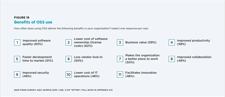 《报告》显示,开源的价值已超越单纯的成本节约:63%提升软件质量,59%创造商业价值,58%提升生产力,51%缩短上市时间,50%减少供应商锁定。