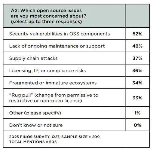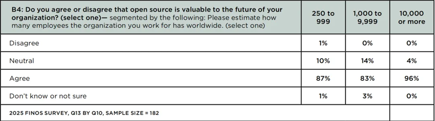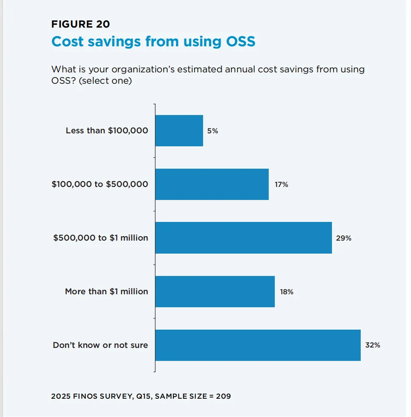但价值量化仍面临挑战:32%的受访者不确定开源带来的年度成本节约,45% 的大型机构表示“无法准确量化”。这一问题导致部分金融机构对开源的投入仍持谨慎态度,难以形成持续的资源支持。