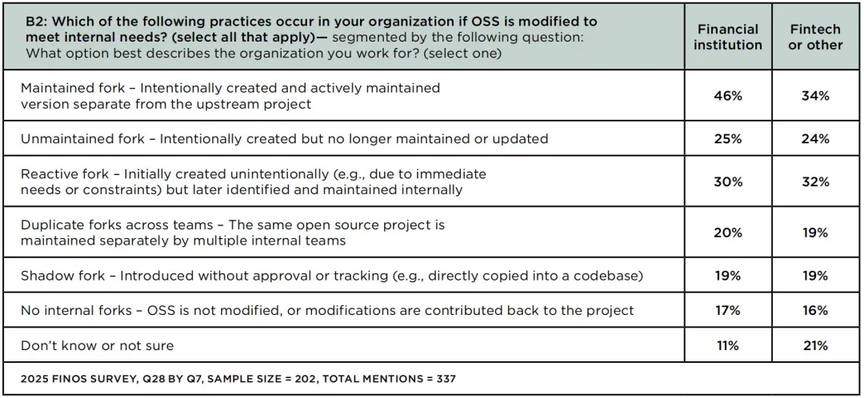 但《报告》也指出,贡献实践仍存在碎片化问题:20%的机构存在“跨团队重复维护同一开源项目分支”的情况,19%存在“未授权或未追踪的影子分支”,46%的金融机构存在“有意维护的独立分支”,这些行为会导致技术债增加、维护成本上升、安全风险累积。