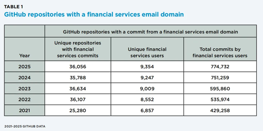 《报告》追踪 2021-2025 年 GitHub 数据发现,金融行业开源贡献持续增长:2025 年有 9,354 名金融机构员工向 36,056 个开源仓库提交了 774,732 次代码提交,较 2021 年分别增长 36.4%、42.6%和 80.5%。
