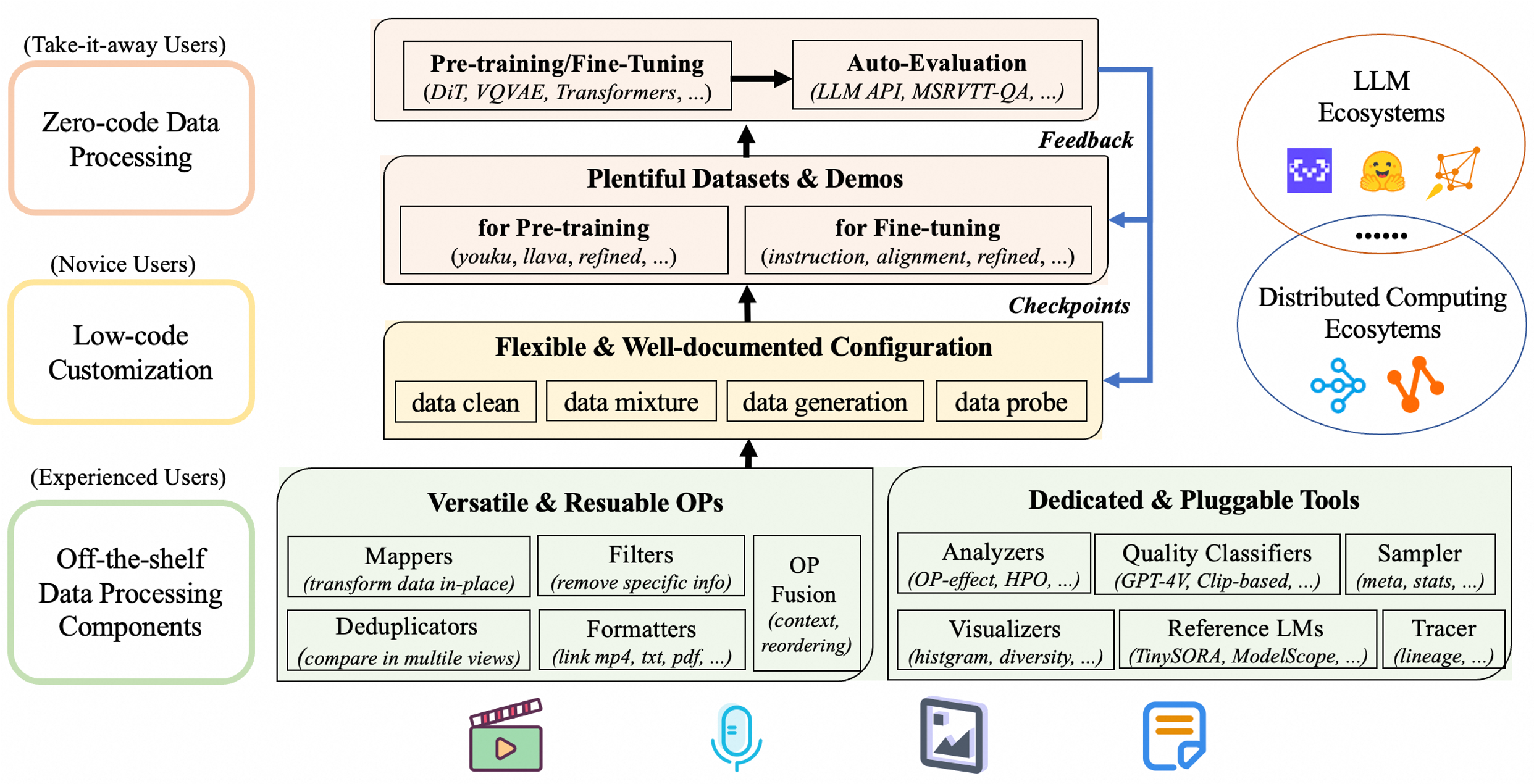 多模态协同处理引擎:内置文本、图像、视频、音频等专用算子,支持视觉-文本-时序数据的联合清洗与增强,避免传统工具链的"碎片化"处理。