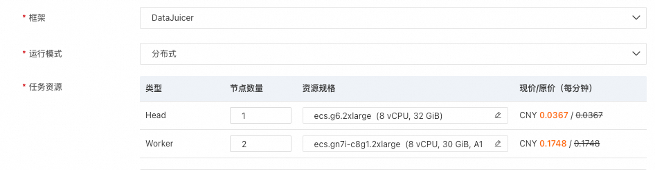 Step3 资源配置:选择 DataJuicer 框架,选择分布式的运行模式,并配置如下资源。