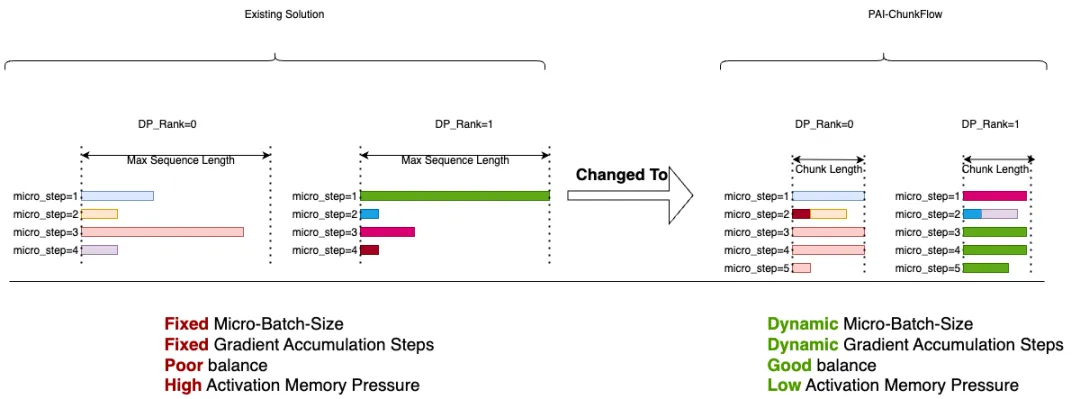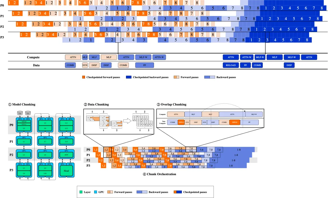 针对大规模 MoE 模型,PAI 提供 paiMoE 引擎。paiMoE 核心技术含 MoE 高性能训练优化 Tangram 和 长序列训练优化 ChunkFlow,通过统一调度机制、自适应计算通信掩盖、EP 计算负载均衡和计算显存分离式并行等方面深度优化,有效解决工作负载不同、稀疏 MoE 通信占比高等问题,实测达到 Qwen3 训练端到端加速比提效 3 倍。