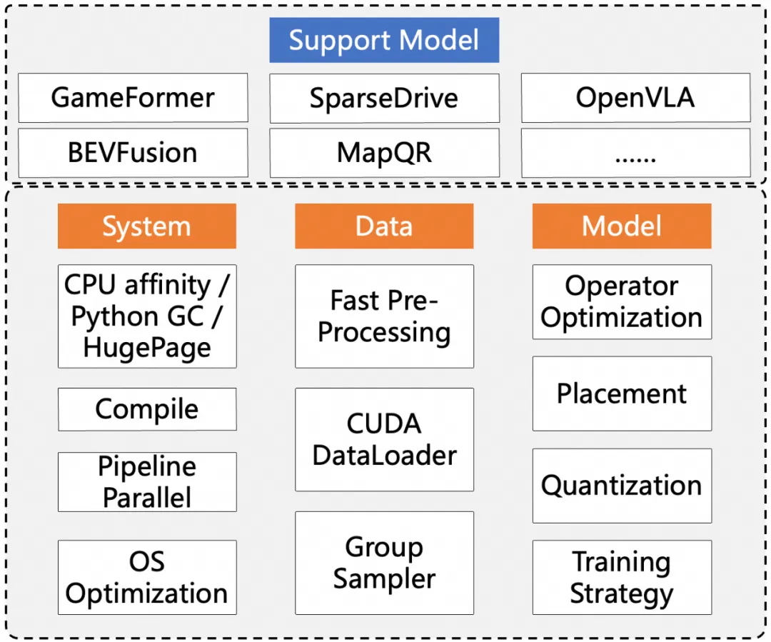 paiTurboX 从系统、数据、模型三个方面针对自动驾驶面临的两大难题进行优化。在系统侧,TurboX 通过优化 CPU 亲和性、流水线并行和动态编译等方案,支持 CPU 计算和 GPU 计算流水并行调度执行,提升模型训练推理效率。