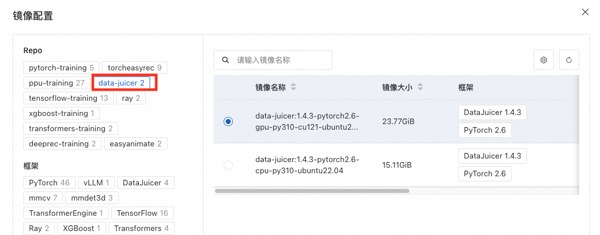 Step2 镜像选择:选择官方镜像,data-juicer:1.4.3-pytorch2.6-gpu-py310-cu121-ubuntu22.04。