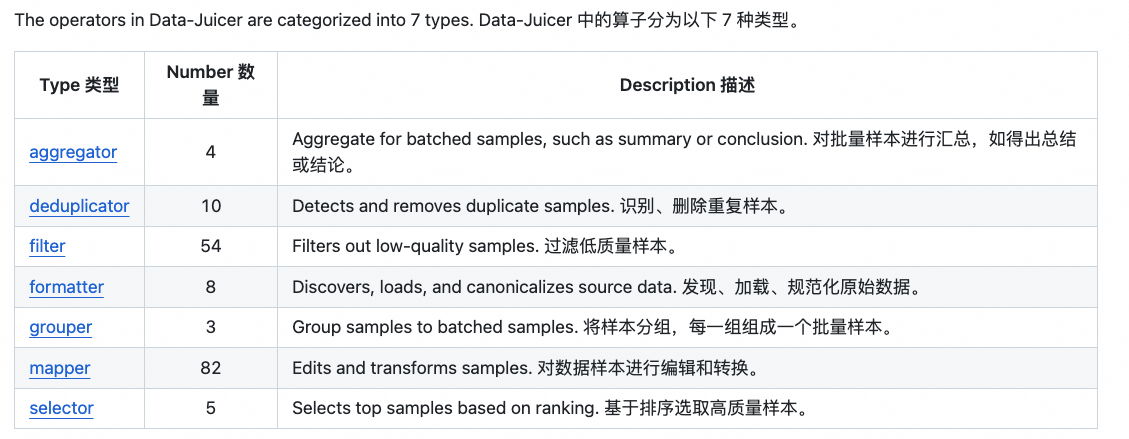 算子丰富:为用户提供 100 多个核心算子,包含 aggregator、deduplicator、filter、formatter、grouper、mapper、selector 等, 覆盖了数据加载和规范化,数据编辑和转换,数据过滤和去重,及高质量样本筛选的数据处理全周期。