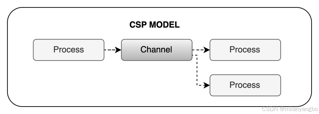 通信顺序进程(Communicating Sequential Process,CSP)是 Tony Hoare 在 1978 年提出的一种描述并发系统交互的模式,它正是 Golang 并发模型的灵感源泉。该模型强调通过通信来协调进程之间的交互,而不是共享数据。CSP 模型,包含进程(Process)和通道(Channel)两个概念。1)进程:进程是并发系统中的基本执行单元。每个进程都有自己的独立执行流,并且通过通信进行交互。 2)通道:通道是进程之间进行通信的媒介。它可以看作是一个先进先出的队列,进程可以向通道发送消息或从通道接收消息。当进程向通道中发送消息,如果通道已满,则发送操作会阻塞,直到通道有足够的空间;当进程从通道中接收消息,如果通道为空,则接收操作会阻塞,直到通道中有消息可用。