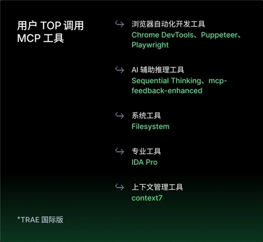 目前,TRAE 支持的 MCP 数量达 1.1 万个。MCP 成为支撑 Web 自动化、全栈开发、深度代码分析等复杂场景的重要基础架构,将大模型的认知能力无缝嵌入到实际工作流中。