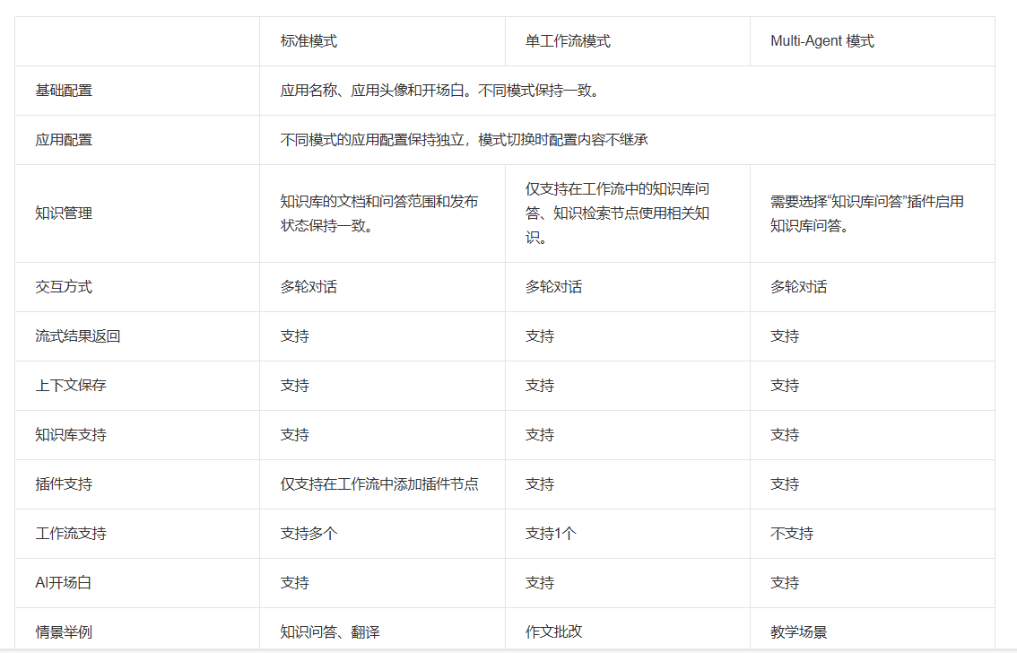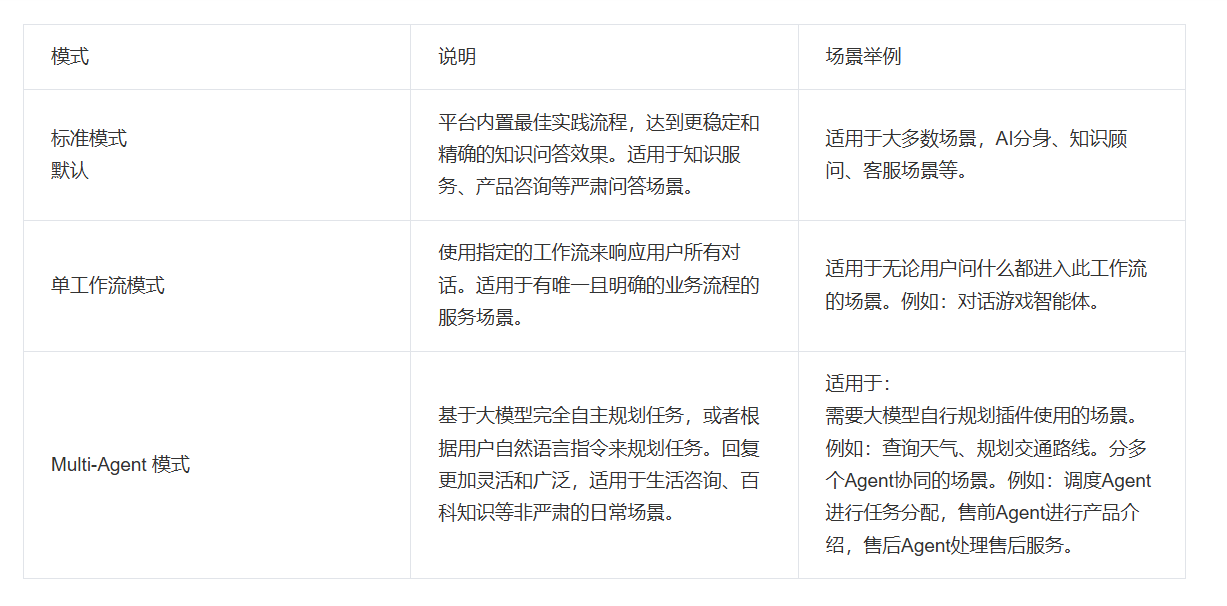 无论是对话式智能体还是公众号智能体,均可以按需选择这 3 类应用模式(标准模式、单工作流模式和 Multi-Agent 模式)