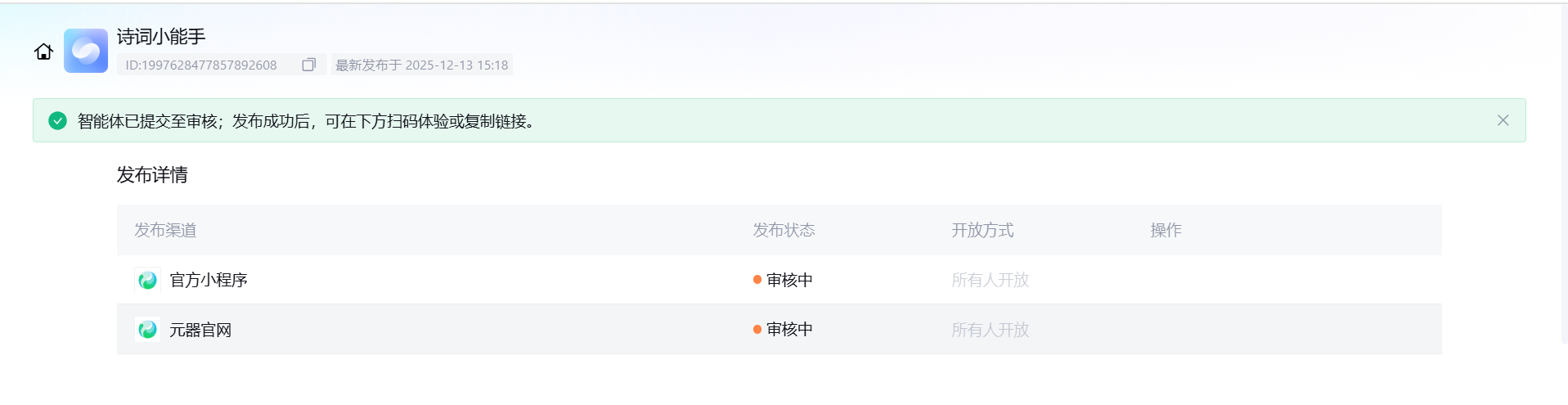 整个审核过程是比较快的,大概 2~5 分钟左右,就可以看到我们的智能体发布审核成功了