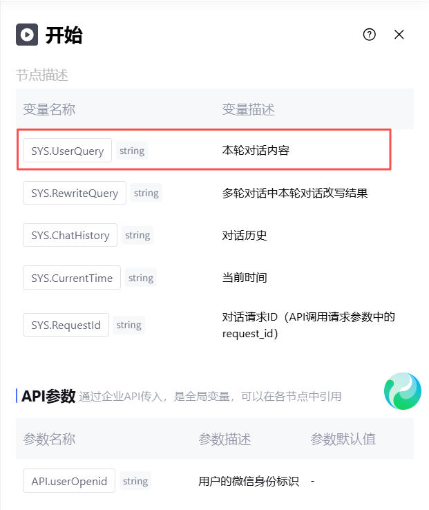 开始节点属于基础节点,用于标识工作流的启动,是整个工作流的入口。包括系统变量、API 参数、输入变量等,这里我们后续主要通过系统变量中 的 SYS.UserQuery 来获取用户对话输入的内容